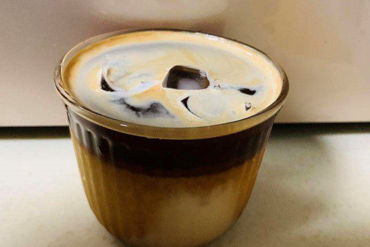 热水冲泡咖啡粉,用搅拌器快速搅打出咖啡泡沫;再混合入厚椰乳,即可饮用